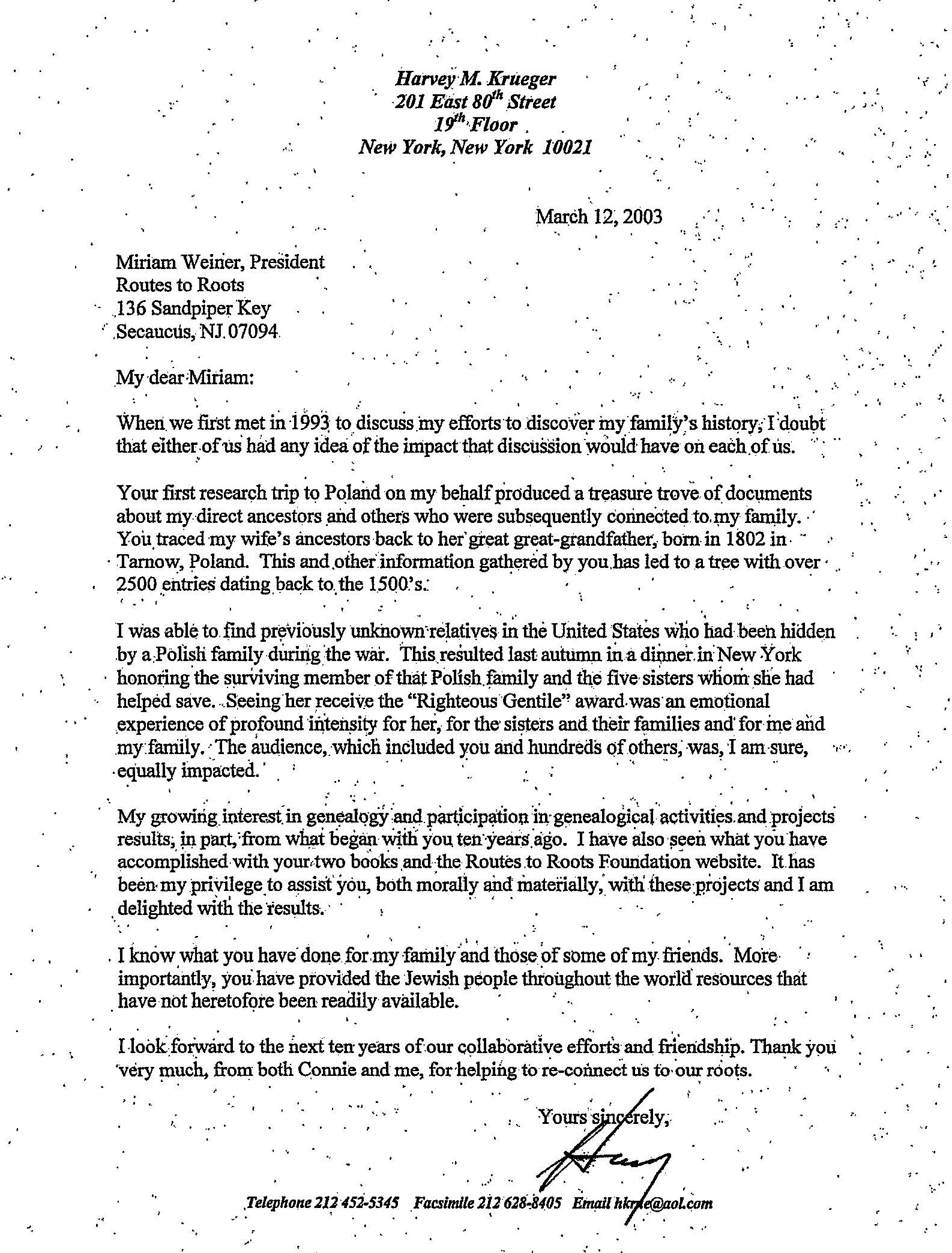 For the past decade, I've had the privilege of witnessing your achievements as a lecturer, newspaper and magazine columnist, author, genealogical tour director and award winner. Each of your accomplishments has eclipsed your former achievements. When I first reviewed your website several months ago, it became evident to me that this was your greatest achievement to date. I join with other members of the Jewish genealogical community in congratulating you for your ground-breaking website.
